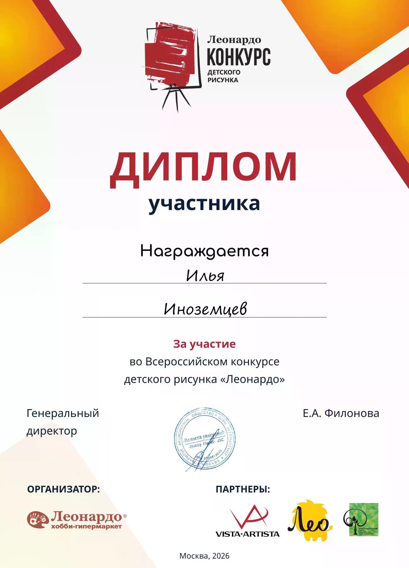 Иноземцев Илья принял участие во Всероссийском конкурсе детского рисунка Леонардо, Москва, 2026г