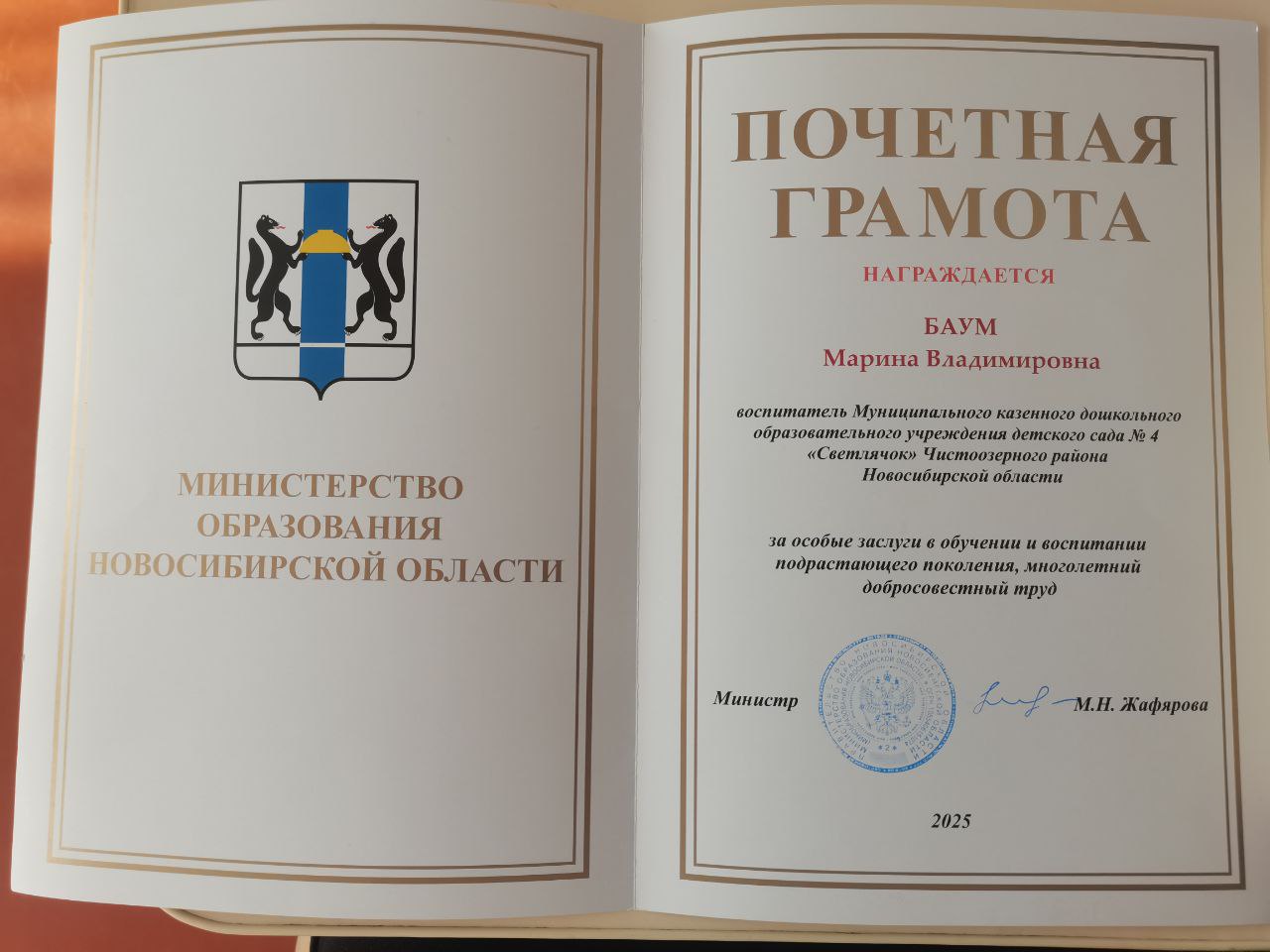 Почётная грамота Министерства образования Новосибирской области за особые заслуги в обучении и воспитании подрастающего поколения, многолетний добросовестный труд